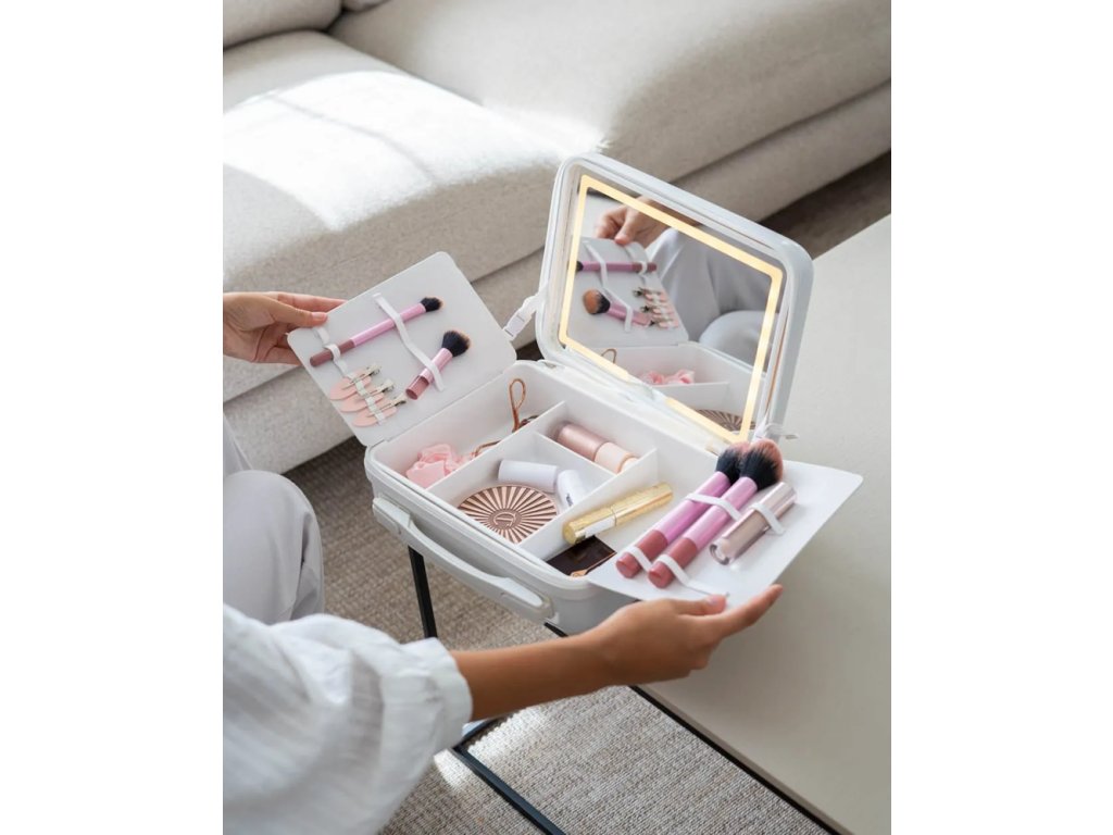 Praktický a moderný kozmetický kufrík je ideálnym riešením na uloženie a prenášanie make-upu doma aj na cestách. Vďaka integrovanému zrkadlu v veku a nastaviteľnému LED osvetleniu umožňuje pohodlné líčenie kdekoľvek, bez ohľadu na svetelné podmienky.