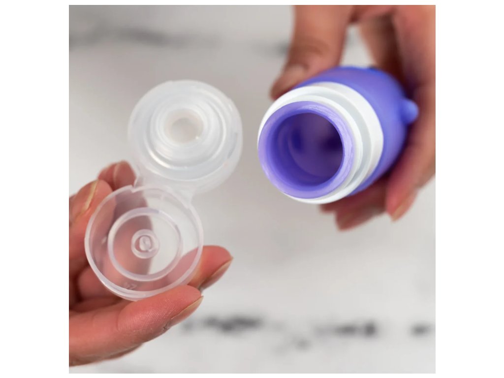 Táto sada obsahuje tri silikónové stláčacie fľaštičky s objemom 60 ml, v žltej, tyrkysovej a fialovej farbe. Fľaštičky sú navrhnuté s ohľadom na deti, sú nepriepustné a ľahko stlačiteľné.